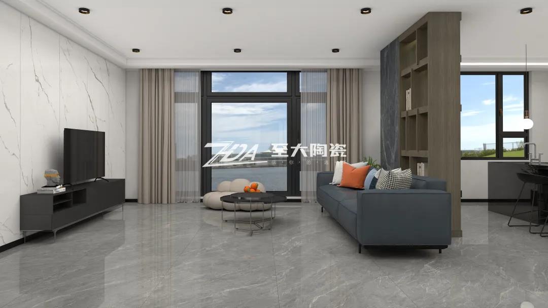 空间地面选用了简约大气的普斯顿灰来铺设,与黑色电视柜、白色大理石背景墙相呼应,半包裹出一个宁静素雅的空间,
